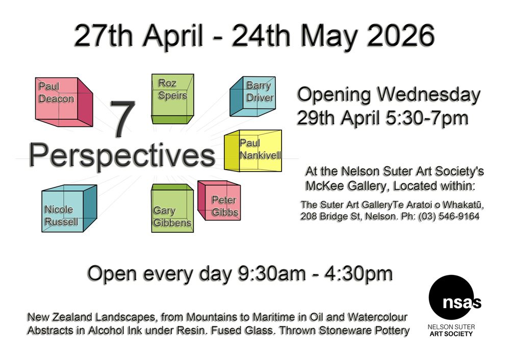 The exhibition "7 Perspectives" is opening today at the McKee Gallery, Nelson Suter Art Society. We are seven artists with completely different styles exhibiting, hence the exhibition title. I am very proud for being part of this exhibition and have created five new bigger watercolour paintings especially for this show. You will be in for a treat! 7 Perspectives at the Nelson Suter Art Society"s McKee Gallery The Suter Art Gallery Te Aragon o Whakatū 208 Bridge Street, Nelson 27th…